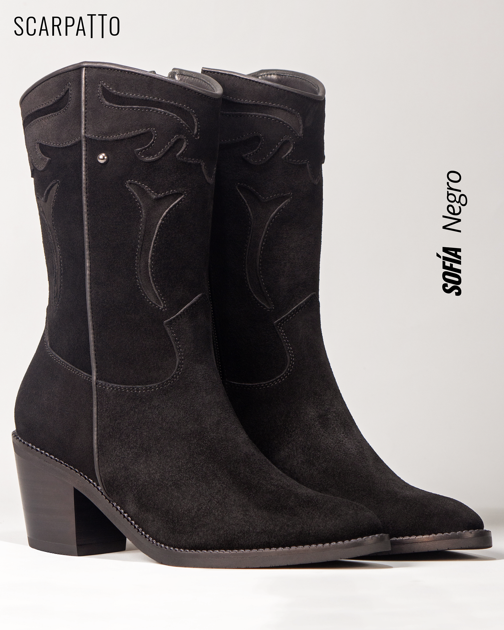 Botas elaboradas y detalladas a mano por experimentados artesanos. Pieles de alta calidad; coronas con diseño indentado; ribetes de cuero liso; cercos en hilo italiano; tacones de madera forrada en cuero; suelas de caucho.