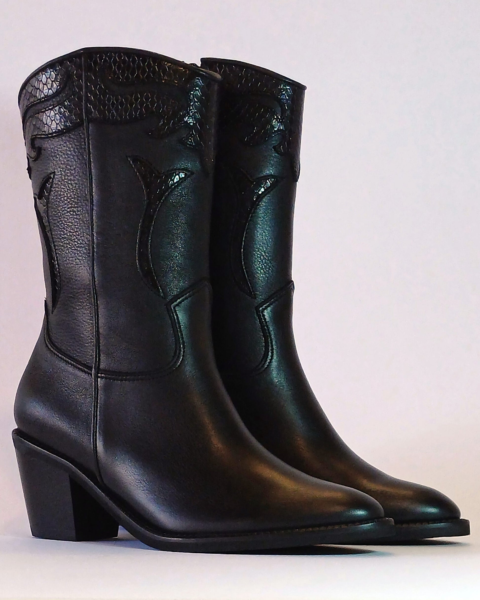 Botas elaboradas y detalladas a mano por experimentados artesanos. Pieles de alta calidad; coronas con diseño indentado; ribetes de cuero liso; cercos en hilo italiano; tacones de madera forrada en cuero; suelas de caucho.