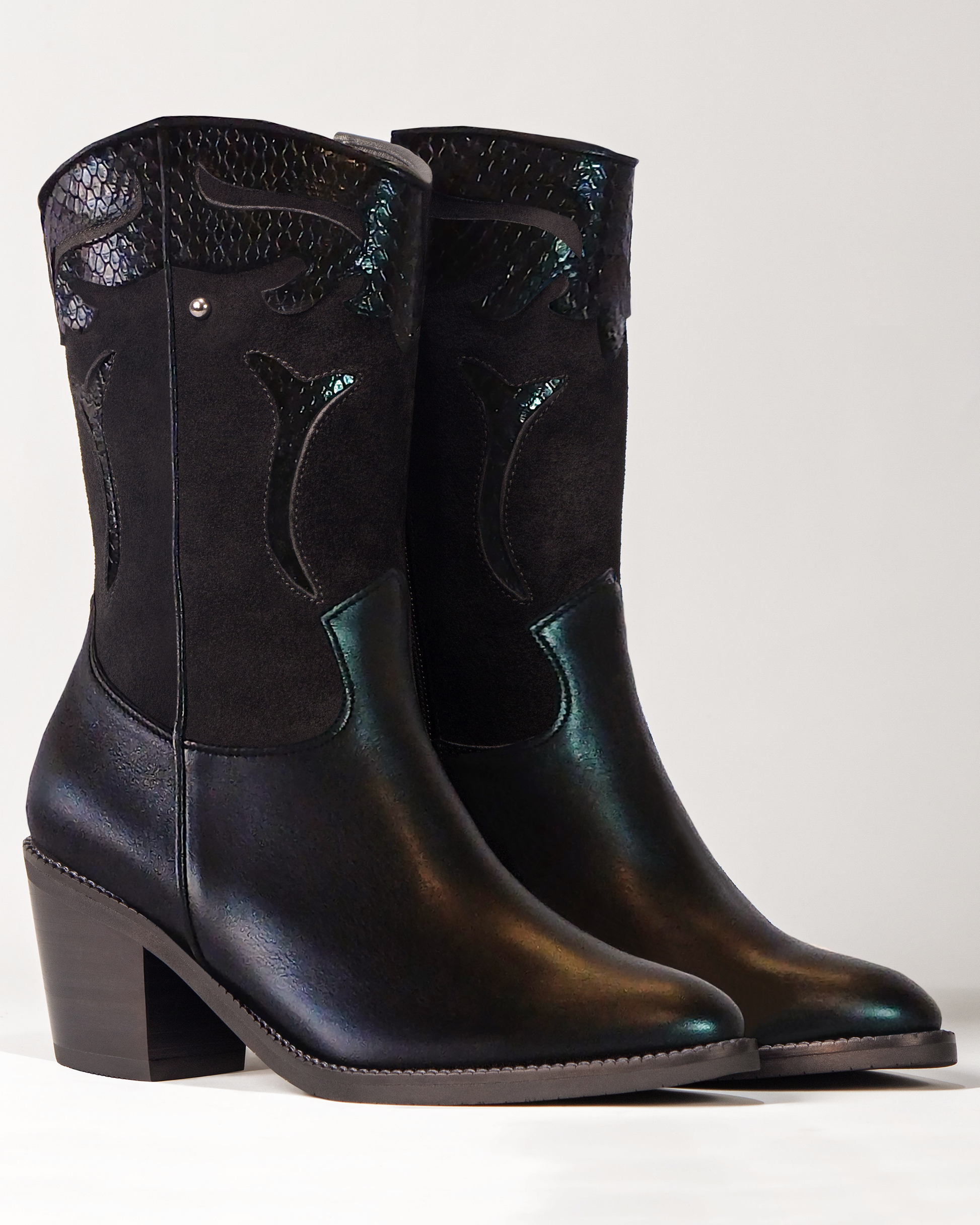 Botas elaboradas y detalladas a mano por experimentados artesanos. Pieles de alta calidad; coronas con diseño indentado; ribetes de cuero liso; cercos en hilo italiano; tacones de madera forrada en cuero; suelas de caucho.