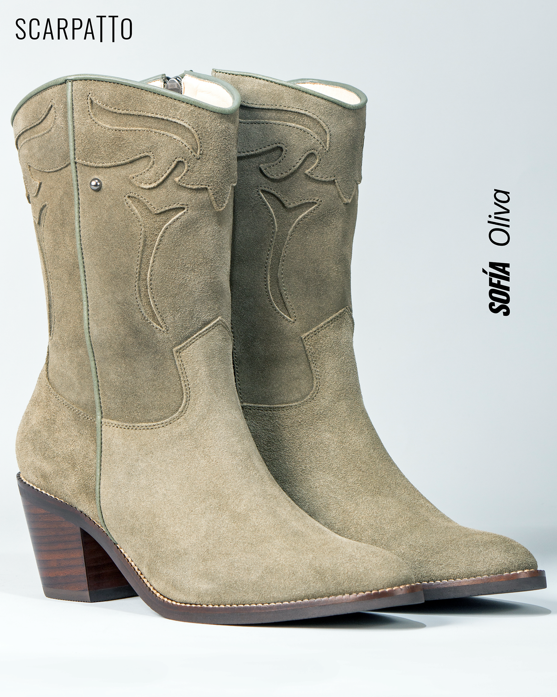 Presenta un cuero en carnaza brasilero (teñido en color verde oliva) con textura aterciopelada semejante a la piel del durazno. Cierre de cremallera.