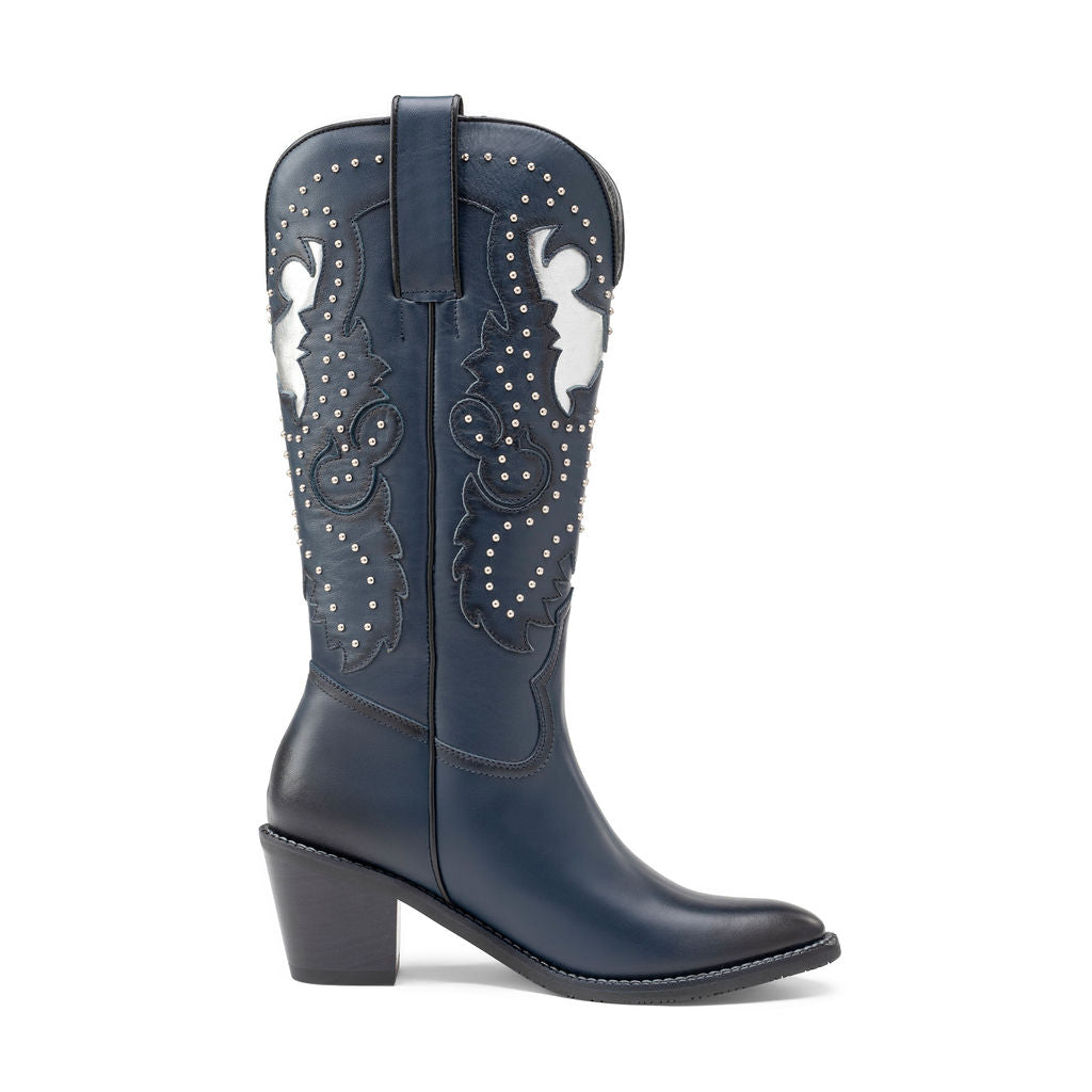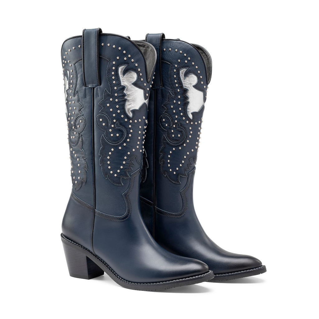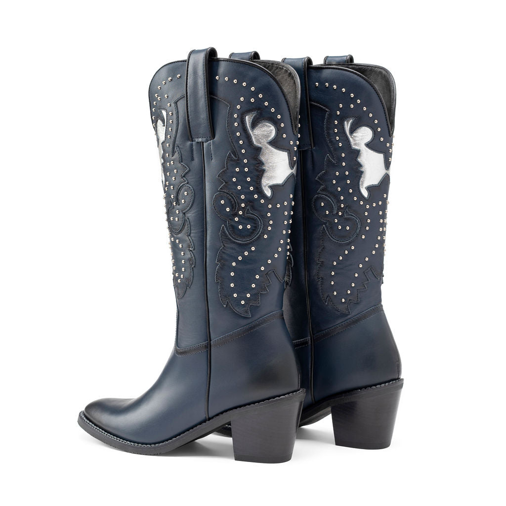 Botas de caña alta que combinan elegancia y personalidad. El tono cobalto profundo se realza con detalles bordados plateados que evocan el espíritu libre y sofisticado de quien las lleva.