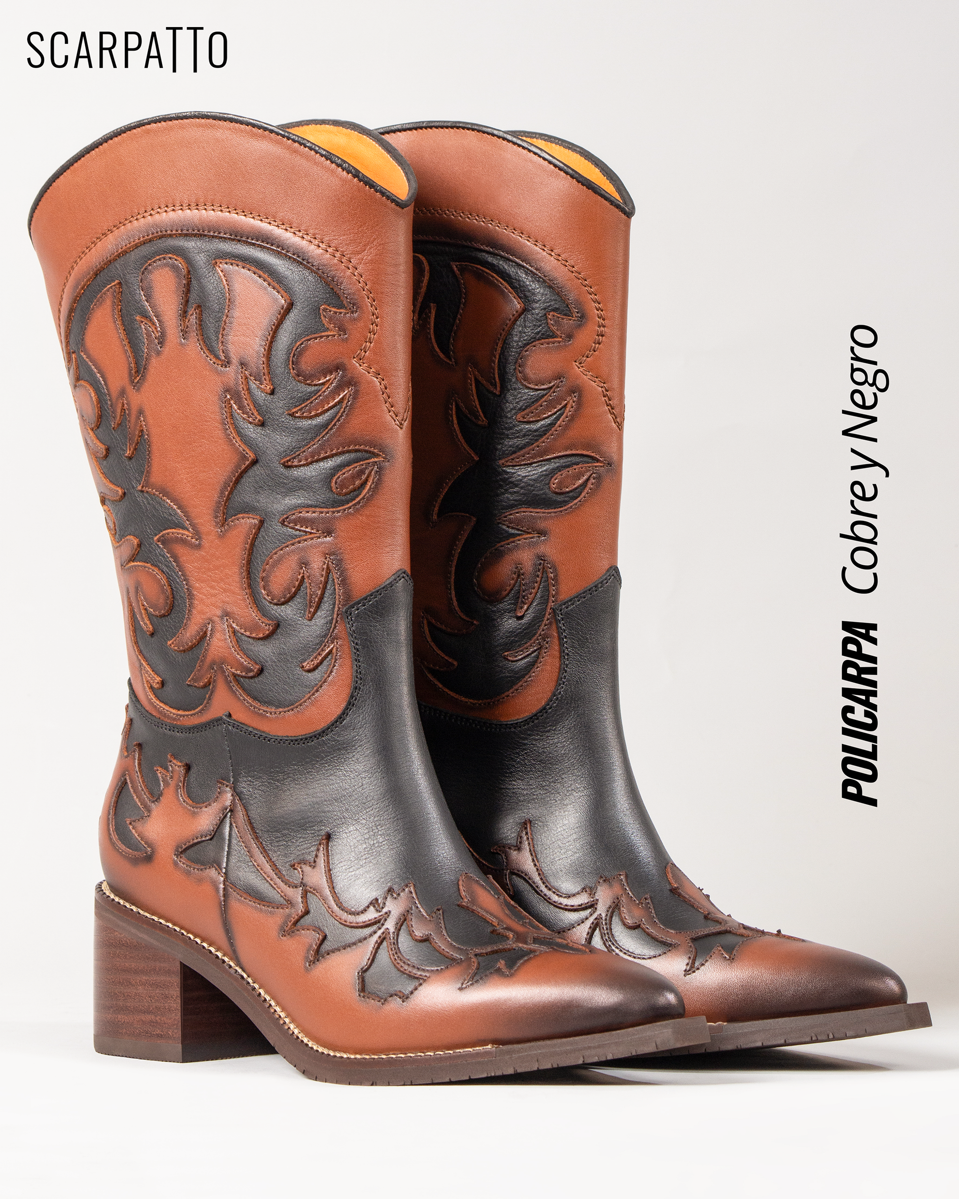 Botas elaboradas y detalladas a mano por experimentados artesanos. Pieles de alta calidad; coronas con diseño curvo; ribetes de cuero liso; cercos en hilo italiano; tacones de madera forrada en cuero; suelas de caucho.