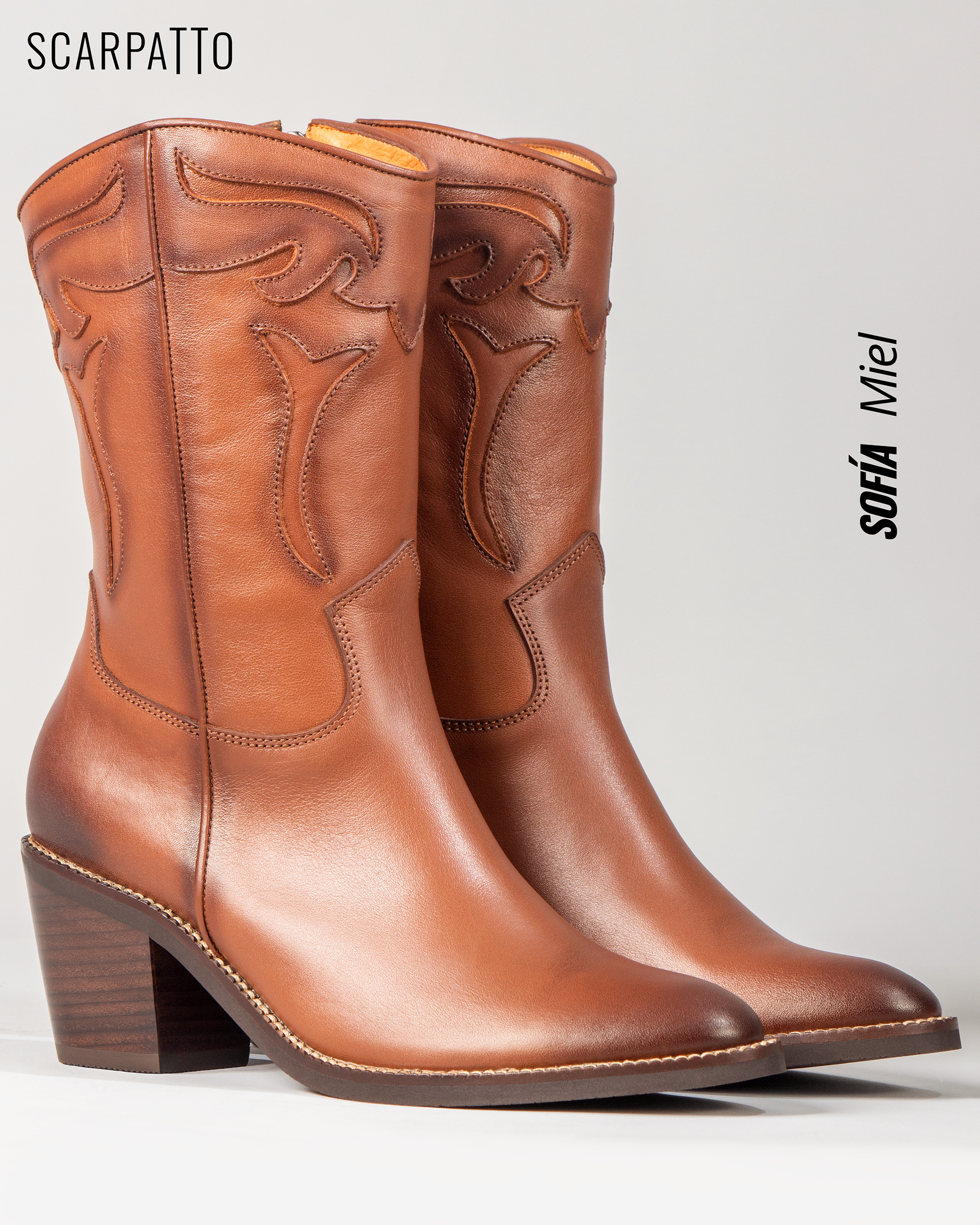 Botas elaboradas y detalladas a mano por experimentados artesanos. Pieles de alta calidad; coronas con diseño indentado; ribetes de cuero liso; cercos en hilo italiano; tacones de madera forrada en cuero; suelas de caucho.